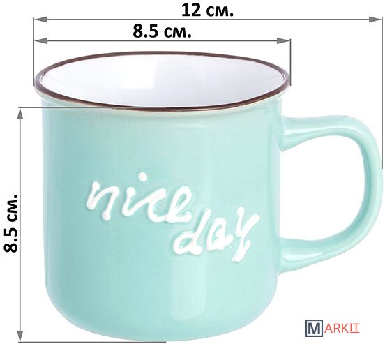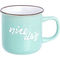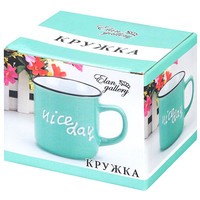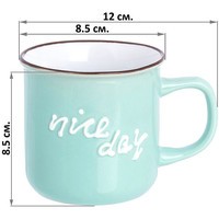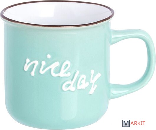 Кружка серии «Nice day» объемом 350 мл выполнена из качественной цветной керамики с рельефным рисунком на стенке и ободком контрастного цвета по краю.