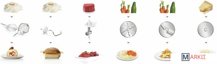| Функции | мясорубка, взбивание, смешивание, замешивание дрожжевого теста, терка, шинковка, ломтерезка |