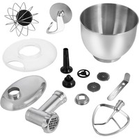 Комплектация:Моторный блок с базой - 1 штЧаша - 1 штКрышка чаши - 1 штВенчик для взбивания - 1 штНасадка для смешивания - 1 штКрюк для замеса теста - 1 штМясорубка:- корпус - 1 шт- толкатель - 1 шт- загрузочный лоток - 1 шт- шнек - 1 шт- нож - 1 шт- решётка с крупными отверстиями - 1 шт- решётка со средними отверстиями - 1 шт- решётка с мелкими отверстиями - 1 шт- кольцевая гайка - 1 шт- насадка для продавливания теста - 1 шт- насадка для изготовления колбас - 1 шт- насадка для кеббе - 1 штРуководство по эксплуатации