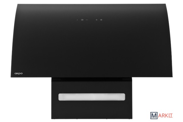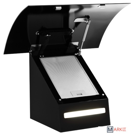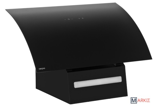 Современная наклонная кухонная вытяжка польского производства с подъемным механизмом стеклянной сферической крышки, c сенсорным и дистанционным управлением, а также таймером отключенияНоминальная мощность турбины 450 м3/чПроизводительность капота 244 - 397 м3/ч