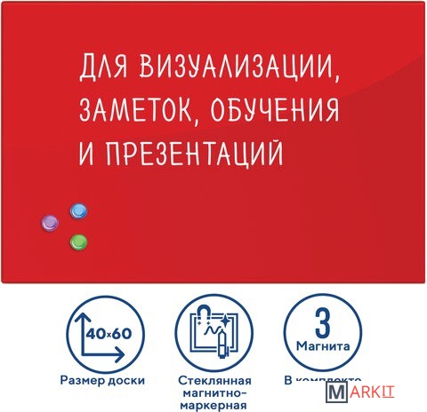 Стеклянная магнитно-маркерная доска BRAUBERG — это современная альтернатива обычным магнитно-маркерным доскам. Позволяет писать маркерами и прикреплять листы.Рабочая поверхность красного цвета изготовлена из небьющегося стекла. Размер доски — 40х60 см. Надежно упакована в защитную пленку и красочную подарочную коробку с ручкой. 3 специальных неодимовых магнита и элементы крепления входят в комплект. Скрытый тип крепления с задней стороны поможет вписать доску в любой интерьер.