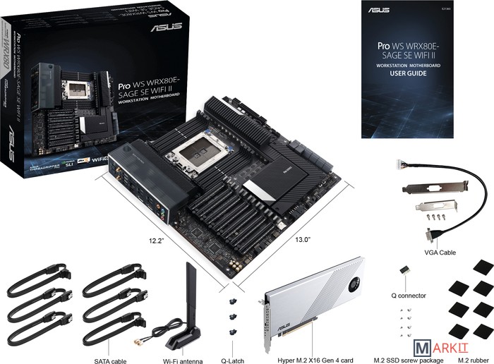 - 6 кабелей SATA- кабель VGA- Wi-Fi антенна- карта расширения Hyper M.2 x16 Gen 4- 3 Q-защелки- Q-коннектор- 7 уплотнителей для односторонних накопителей М.2- винты для установки M.2 SSD накопителей и карты расширения- DVD-диск- документация