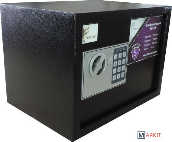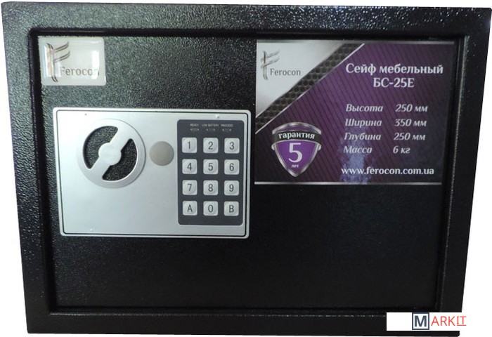 Мебельный сейф ТМ «Ferocon» БС-25Е со встроенным электронным замком создан для хранения ценных вещей и денежных средств. Современный дизайн сейфа хорошо впишется в любой интерьер, а небольшие размеры позволят вмонтировать сейф в стену, пол или мебель. Электронная система питается от 4 пальчиковых батареек. На панели присутствует индикатор заряда батареи, который избавит Вас от лишних забот.На сейф установлена 2-х ригельная система запирания. Петли находятся внутри, что дает эффективную защиту от взлома. Дверь открывается на 100°, делая процесс вложения/извлечения вещей комфортным.В комплектации идет 2 ключа, коврик и 4 батарейки. Сейф может быть прикреплен к стене или полу при помощи анкерных крепежей.