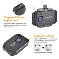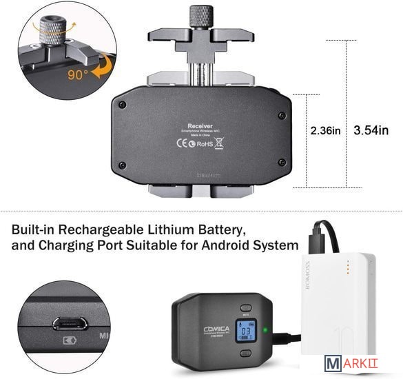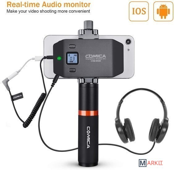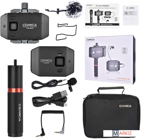 Радиосистема CVM-WS50B с петличным микрофоном идеальна для записи блога или ведения трансляции со смартфона. Также, модель отлично подойдет любителям мобильного кино, поскольку позволяет быстро и качественно записать звук и сэкономить время на сведении.Устройство имеет 6 переключаемых каналов связи, и передаёт сигнал на расстояние до 60 м на открытом пространстве без препятствий. В случае, если во время работы на записи слышны помехи, рекомендуется перевести смартфон в режим "полета".На корпусе трансмиттера и ресивера присутствует ЖК дисплей, показывающий режим работы, номер канала, состояние батареи и уровень сигнала. На ресивере добавлен разъём mini Jack для подключения наушников, что позволяет следить за качеством звука во время съёмки. Зарядить устройство можно при помощи стандартного micro USB.Металлический держатель для смартфона и удобная ручка упрощают работу с записью видео и звука, ведь вы можете снимать установив передатчик в непосредственной близости от мобильного устройства. Это позволяет не путаться в надоедливых проводах и держать всё необходимое в одном месте. К тому же, в затяжном болте держателя предусмотрено крепление 1/4", на него вы можете установить дополнительное оборудование для съёмки.