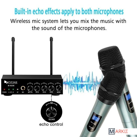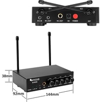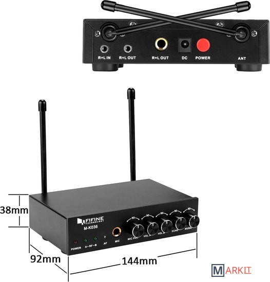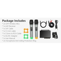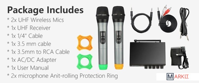 - два радиомикрофона- настольный приемник- аудиокабель 6.3 мм - 6.3 мм- аудиокабель 3.5 мм - 3.5 мм- аудиокабель 2RCA - 3.5 мм- два маркировочных кольца- адаптер питания- документация |
