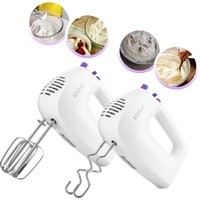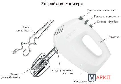 Класс защиты от поражения электрическим током: II;Материал корпуса: пластик;Материал насадок: хромированная сталь;Размеры: 195x80x135 мм;Вес: 0.9 кг.Комплектация:- миксер;- 2 венчика для взбивания;- 2 крюка для замеса;- руководство по эксплуатации.