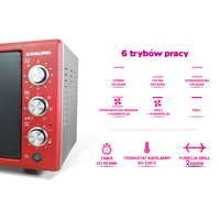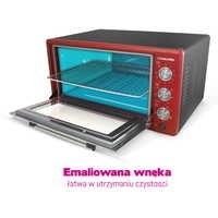 45 л вместимостьМногофункциональный выбор режима приготовления (нагрев вниз / вверх / вверх и вниз, горячий воздух, вертел и горячий воздух)Регулировка температуры: 40-230°С .Функция горячего воздухаБарбекю90-минутный таймерЗвуковой сигнал окончания приготовленияНагревательный элемент из нержавеющей сталиВ комплекте противень, решетка для гриля и вертел.Двойное остекление – новый стандартСтекло Low E - низкое тепловыделение наружуЭмалированный интерьерВставные ручки (защита от случайного включения)2 нагревателя (верхний работает в двух диапазонах мощности 600 Вт/1200 Вт, нижний 800 Вт)Номинальная мощность 1400 Вт [суммарная мощность нагревателей 2000 Вт]внутренние размеры : ширина: 44 см, высота: 24 см, глубина: 38 см