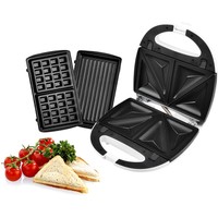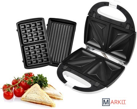 В комплекте три съемные пластины с антипригарным покрытием: для приготовления сэндвичей, для гриля и вафель.