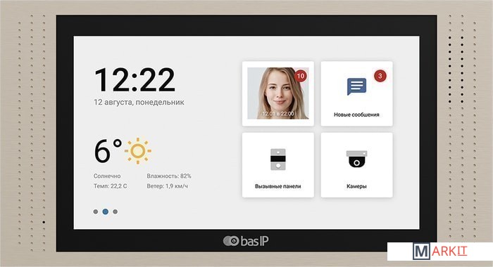 Внутренний 7-дюймовый IP-видеодомофон с IPS-экраном, разрешением 1024x600, возможностью подключения датчиков тревоги, и подключением кнопки звонка. Внутренний видеодомофон работает под управлением операционной системы Android 6.0. Имеет два варианта установки: настенное накладное крепление и крепление врезным монтажом с использованием специального кронштейна.
