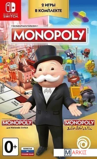 Лучшая Monopoly в истории! Сыграйте в лучшую Monopoly в истории и получите в два раза больше впечатлений, ведь вас ждет комбо из Monopoly ДЛЯ Nintendo Switch и Monopoly: Переполох!Monopoly:Играйте в классическую игру, наблюдая за тем, как оживает доска и меняется трехмерный город в ее центре. Меняйте правила по своему вкусу. Monopoly для Nintendo Switch – это классика нового уровня!Monopoly: Переполох:Новый взгляд на любимую Monopoly. Участвуйте в более коротких раундах, обходите противников на запутанных улицах города, собирайте ресурсы, покупайте и улучшайте недвижимость, стройте козни соперникам и избегайте их ловушек. Настоящий переполох!Трехмерный город в центре доски меняется по ходу игрыВ этом миниатюрном мире каждый район уникален. Почувствуйте себя его правителем и наблюдайте за тем, как растет ваша империя!Меняйте игру по своему вкусуОживите ее быстрым режимом или выберите одно из 6 правил, отобранных поклонниками Monopoly со всего мира!Находите до 6 других игроков по сети и сражайтесь с ними в быстрых матчах или персонализированных сессиях, выбрав свой способ игры! Станьте победителем и получите все!