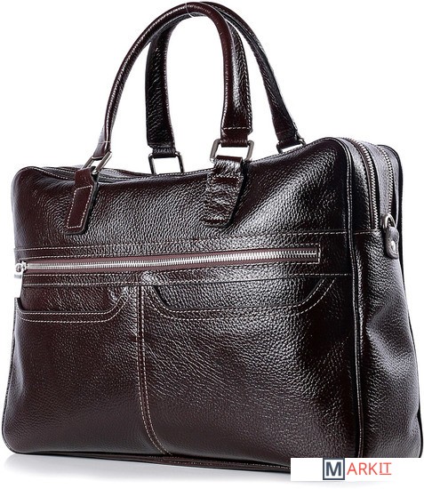 Сумка из натуральной кожи на два отделения, закрывающиеся на застежку-молнию, с ручками на полукольцах, с регулирующимся ручкой-ремнем, на задней стенке карман, закрывающийся на застежку-молнию, сдвумя открытыми карманами на передней стенке и карманом, закрывающимся на застежку-молнию, с прокладкой кедера. Сумка на подкладке, с подвесным карманом, закрывающимся на застежку-молнию, с окантовкой карманов, с двумя открытыми карманами.