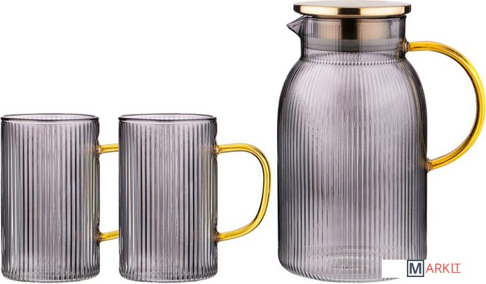 Набор выполнен из жаропрочного стекла, который выдерживает высокую температуру кипящей воды.Дизайн кувшина и кружек выполнен в сдержанном стиле, он универсален, подходит к любому интерьеру и входит в коллекцию SMOKY.Набор предназначен для подачи на стол сока, морса и других, не только холодных, но и горячих напитков.Крышка кувшина снабжена силиконовым уплотнителем, благодаря которому она надежно удерживается на корпусе с фильтром из двух видов отверстий.Носик кувшина выполнен по технологии анти-капля, таким образом, наливая жидкость в стакан, Вы не прольете ни капли.Набор прост в использовании, за ним легко ухаживать - достаточно лишь помыть в теплой воде с мыльным раствором. Не рекомендуется мыть в посудомоечной машине.