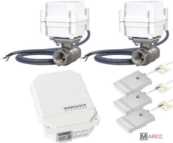 Комплект Gidrоlock Standard Bonomi 3/4" служит для своевременного оповещения в случае появления протечки воды, а также автоматически перекрывает подачу воды при помощи шаровых электроприводов (идут в комплекте).