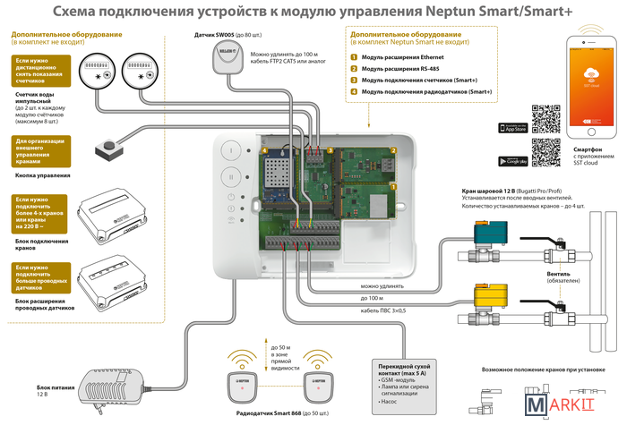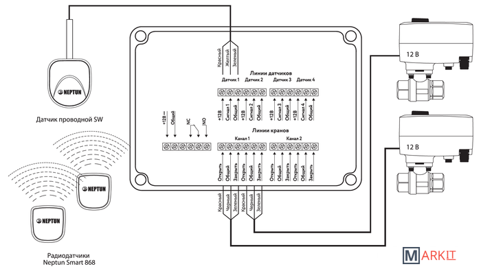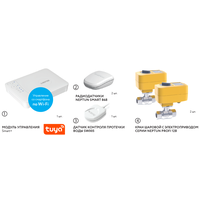 Комплектация Модуль управления Neptun Smart+ - 1 штКран шаровый с электроприводом Neptun Profi 12В 3/4 дюйма - 2 штРадиодатчик Neptun Smart 868 - 2 шт.Датчик проводной SW005 (длина 2 м.) - 1 шт.