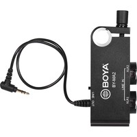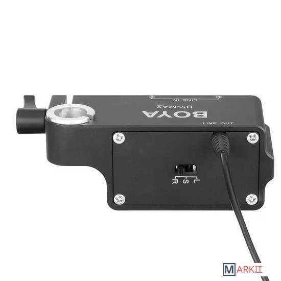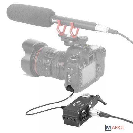 Boya BY-MA2 представляет собой 2-канальный XLR аудио микшер, который предназначен для зеркалок, видеокамеры и других устройств, который имеет 3.5 мм аудио разъём TRS. BY-MA2 имеет 2 аудиовхода XLR, которые позволяют использовать 2 внешних приемника беспроводных микрофонов XLR или микрофоны-дробовики XLR. BY-MA2 может помочь улучшить качество встроенного звука и качество звука на видеокамерах или зеркальных фотокамерах.BOYA BY-MA2 также имеет встроенный комбинированный разъем 6.35 мм, который позволяет подключать инструментальные входы, такие как гитара или другие инструменты с выходным разъемом 6.35 мм. BY-MA2, оснащен стандартной штангой 19 мм, его можно легко прикрепить к любой камере, оснащенной штангой 19 мм.Между тем, в комплект входит адаптер для стержня с болтом на 15 мм, который позволяет ему быть совместимым с любыми клетками со стержнем 15 мм. Внизу он имеет 3 стандартные внутренние резьбы 1/4”-20, которые позволяют этому аудиомикшеру подключаться к любым корпусам камеры (с отверстиями для принадлежностей 1/4) с помощью винта 1/4”-20, или он может располагаться на горячем башмаке цифровых зеркальных фотоаппаратов сразу после правильной установки прилагаемого адаптера для холодного башмака.Основные особенности:- кольцо для крепления 19 мм. (для установки микшера на любой опорной стойке для камеры 19 мм.)- кольцо для крепления 15 мм. (для установки микшера на любой опорной стойке для камеры 15 мм.)- переключатели XLR1/MIX/XLR2- адаптер для крепления холодного башмака- пассивная работа- литое алюминиевое шасси
