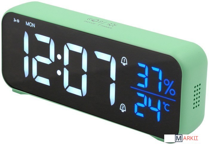 Особенности:— Современный дизайн— Возможность работы от аккумулятора/USB/сети— Яркие, заметные издали цифры— Регулируемая яркость— Запоминание настроек при отключении питания— Качественный приятный звук будильника— Встроенный термометр и гигрометр— USB-выход для зарядки гаджетов— Возможность настройки разных режимов будильника (будни/выходные)