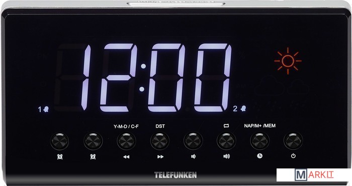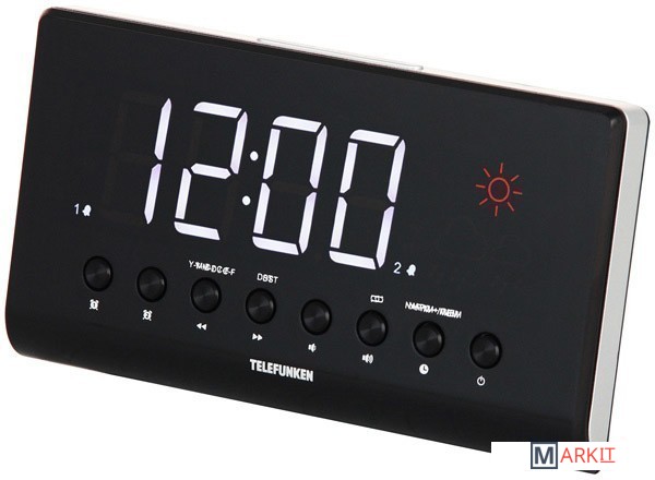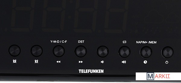 Радиобудильник Telefunken TF-1552 имеет кварцевый стабилизатор, светодиодный дисплей с высотой символов 1,4" (3,5 см), FM-тюнер, проекционные часы с синхронизацией времени на дисплее, 2 режима работы будильника (радио/сигнал), повторный сигнал будильника, таймер автоматического выключения радио, календарь, прогноз погоды, встроенный термометр, выходная мощность: 180 мВт.