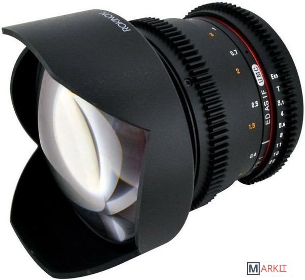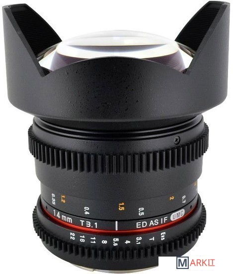 Широкоугольный объектив с ручной фокусировкой Samyang 14 mm T 3,1 ED AS IF UMC VDSLR предназначен для полноразмерных цифровых фотоаппаратов. Сделан специально для использования с механизмами видеосъёмки цифровыми зеркальными фотоаппаратами. На корпусе объектива нанесена шкала дистанции и диафрагмы с поворотом на 90 градусов. Фокусировочное кольцо и кольцо диафрагмы имеет специальную зубчатую передачу и плавный ход. Объектив выполнен в надежном и качественном корпусе из металла и пластика с металлическим байонетом.