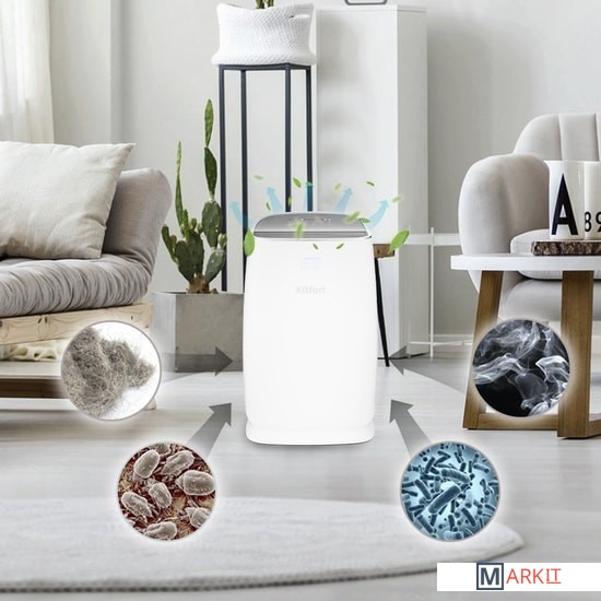 Очиститель воздуха КТ-2816 - очищает воздух и создаёт более комфортные условия для дыхательных путей в помещении, помогая сохранить хорошее самочувствие. Он предназначен для удаления из воздуха пыли, микробов, аллергенов, бактерий и неприятных запахов.Очиститель воздуха работает автоматически. Просто включите его и следите за износом фильтров. Прибор также имеет 3 скорости работы (на первой работает бесшумно), таймер, ночной режим и блокировку для защиты от детей.За блоком фильтров, в левом углу, находится датчик пыли. Он определяет качество воздуха, и, примерно, через минуту на дисплее отображает текущее количество частиц РМ1,0 в окружающем воздухе.
