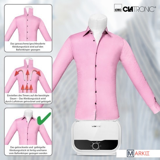 Гладильный манекен Clatronic HBB 3734 система 2 в 1 даёт возможность сушить и гладить ваши вещи разного размера (XS - S - M - L - XL - XXL).В системе есть таймер на 180 минут непрерывной работы и две ступени температуры (холодно / тепло).Телескопическая стойка в нужный момент легко регулируется до нужной, подходящей именно вам, длины.