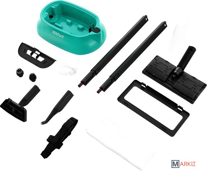 Kitfort КТ-9102 способен заменить паровую швабру, дезинфектор, стеклоочиститель, отпариватель. Горячий пар под давлением в 4 бара очищает разные поверхности, удаляет жир, известковые отложения, убивает патогенные микроорганизмы, отпаривает ткани.Скребок для стекла используется для чистки окон, зеркал, кафеля. Струйная насадка подходит для чистки плинтусов, щелей и других углов. Щётки - для удаления стойких загрязнений. С тряпкой можно отпаривать одежду, шторы, мягкую мебель.В комплект, помимо различных насадок, входят также щётка для пола, тряпка, рамка для чистки ковров, удлинительные трубки, что делает КТ-9102 максимально универсальным устройством для очистки, глажки, дезинфекции самых разных поверхностей.Управление располагается на паровом пистолете. Вращение регулятора позволяет плавно регулировать интенсивность пара. Кнопка подачи пара располагается под пальцем. Предусмотрен блокиратор от случайного нажатия или для включения непрерывной подачи пара.На корпусе есть кнопка вкл/выкл. Индикатор готовности пара загорается, когда давление пара в бойлере достигает максимального значения и гаснет, когда давление пара падает. Индикатор справа информирует об отсутствии воды.Чтобы насадки не терялись, в подставке пароочистителя можно хранить все насадки.В комплекте с пароочистителем идёт мерный стакан для удобного добавления воды в бойлер.В случае возникновения в бойлере избыточного давления предохранительный клапан, встроенный в крышку бойлера, стравит пар, пока давление не опустится до безопасного уровня.