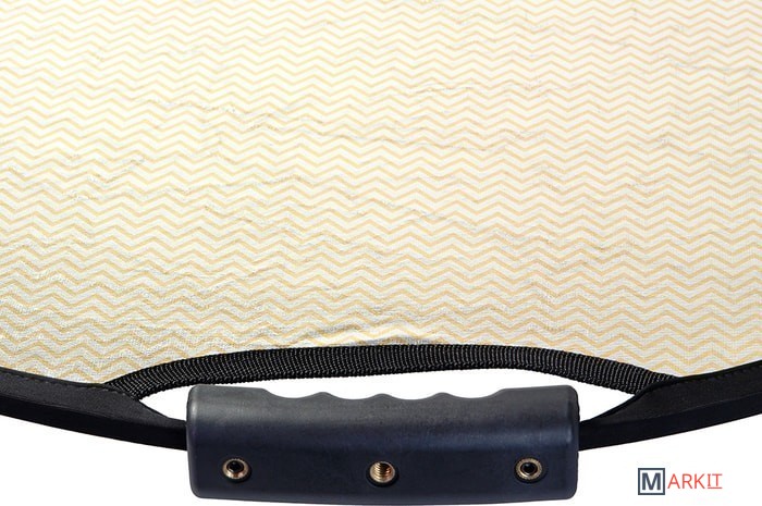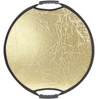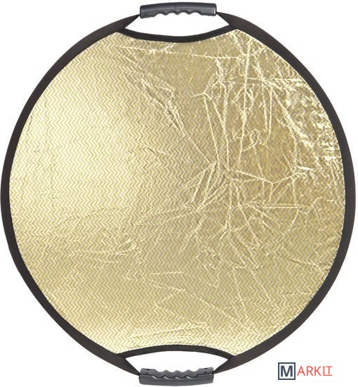 Односторонний круглый отражатель, золотистые и серебристые полоски. Диаметр 56 см, используется в предметной и портретной съемке, а также для подсветки отдельных участков кадра.Золотисто-серебристые полоски модифицируют световой поток от источника в эффективный умеренно теплый и мягкий световой поток, перенаправляемый на объект съемки.Стальной упругий каркас прошит по периметру капроновым карманом, диаметр отражателя в сложенном виде – 20 см. Две рукоятки, закрепленные на каркасе, оборудованы отверстиями с резьбой 1/4", что позволяет закрепить отражатель на штативах, стойках или любых других опорах, без использования специального держателя.