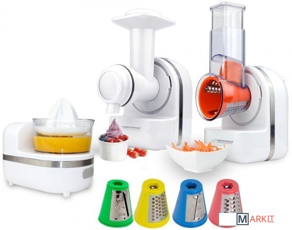 | Функции | цитрус-пресс, терка, шинковка, ломтерезка, приготовление мороженого |