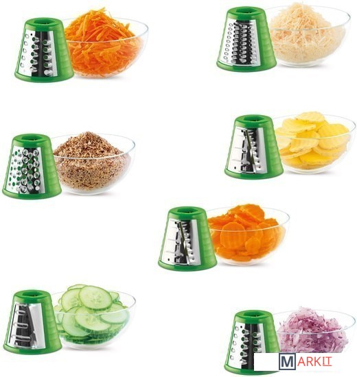Слайсер может нарезать картофель на тонкие ломтики для жарки, либо фрукты и овощи для украшения блюд и пр.Терка с волнистыми ножами подходит для нарезки фруктов и овощей на оформление различных блюдКрупная терка используется для шинковки овощей на суп, для приготовления картофельных блинов либо овощных и фруктовых салатов и т. д.Мелкая терка подходит для приготовления фруктовых и овощных салатов либо сырных и овощных паст и т. д.Очень мелкая терка предназначена для измельчения / помола кокоса, миндаля, орехов и для приготовления крошек из твердого хлеба и т. д.