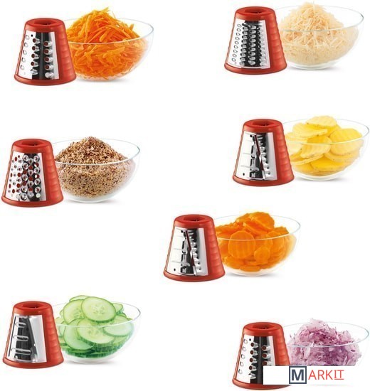 Слайсер может нарезать картофель на тонкие ломтики для жарки, либо фрукты и овощи для украшения блюд и пр.Терка с волнистыми ножами подходит для нарезки фруктов и овощей на оформление различных блюдКрупная терка используется для шинковки овощей на суп, для приготовления картофельных блинов либо овощных и фруктовых салатов и т. д.Мелкая терка подходит для приготовления фруктовых и овощных салатов либо сырных и овощных паст и т. д.Очень мелкая терка предназначена для измельчения / помола кокоса, миндаля, орехов и для приготовления крошек из твердого хлеба и т. д.