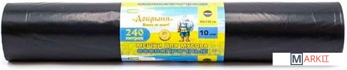 самые прочные мешки серийно выпускаемые, толщина стенок 100 мкм, что дает невероятную грузоподъёмность более 200 кг в сочетании с коэкструзией 3-х слоеным методом производства пленки, в данной серии удалось достичь прочности более 150 мкм при аналогичной продукции из однослойного полиэтилена.Покупая мешки для строительного мусора серии «Добрыня» будьте уверены – они Вас точно никогда не подведут – серия для покупателей не ищущих компромиссы в качестве.