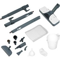 угловая насадка, плоская ворсовая щетка, большая и маленькая нейлоновые щетки, латунная щетка, мерный стакан, воронка, скребок