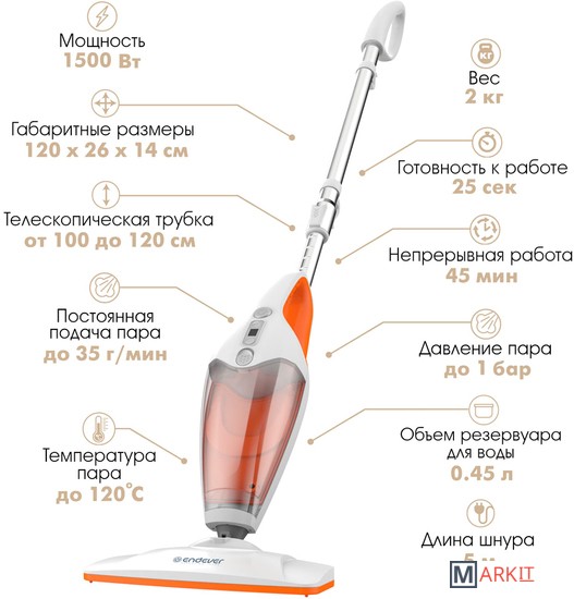 Все мы с Вами знаем, что чистота – это залог здоровья и только в чистом доме присутствует гармония и уют. Для поддержания чистоты в доме мы используем всевозможные бытовые приборы и порой их скапливается очень много в подсобках Ваших домов и девать становится некуда. Решением проблемы по оптимизации количества бытовой техники и объединению функций от разных бытовых приборов является паровая швабра «2 в 1» ENDEVER ODYSSEY Q-622, которая с легкостью трансформируется в компактный ручной отпариватель. А большой комплект дополнительных насадок расширить возможности по вариантам обработки различных поверхностей, таких как ламинированные деревянные поверхности, натуральный или искусственный камень, керамика, линолеум, керамическая плитка, металлические поверхности, стекольные окна, зеркала. Помимо всего прочего, при помощи специальной насадки для одежды Вы сможете еще и отпаривать, и одежду.За короткое время до 25 секунд паровая швабра ENDEVER ODYSSEY Q-622 будет готова к работе и способна проработать до 45 минут без долива воды. Съемный бак для воды рассчитан на 450 мл. За счет высокой мощности достигается хороший показатель степени подачи пара до 35 г/мин. Для удобства есть возможность регулировки степени подачи пара.Помимо непосредственно очистки обрабатываемой поверхности, паровая швабра ENDEVER ODYSSEY Q-622 дополнительно дезинфицирует ее при помощи высокой температуры пара до 120 градусов, уничтожая до 99,9% вредоносных бактерий и микроорганизмов.Дополнительно для безопасной работы в паровой швабре ENDEVER ODYSSEY Q-622 предусмотрены функция защиты от протечки воды и функция защиты от перегрева. Гарантийный срок составляет целых 18 месяцев, в течении которых вы можете абсолютно не волноваться за работоспособность изделия.