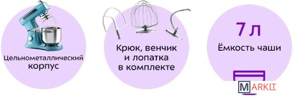 - моторный блок;- чаша миксера;- крышка чаши миксера;- венчик для сбивания;- насадка для смешивания;- крюк для замеса теста;- заглушка;- руководство по эксплуатации.