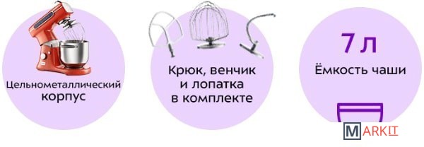 - моторный блок;- чаша миксера;- крышка чаши миксера;- венчик для сбивания;- насадка для смешивания;- крюк для замеса теста;- заглушка;- руководство по эксплуатации.