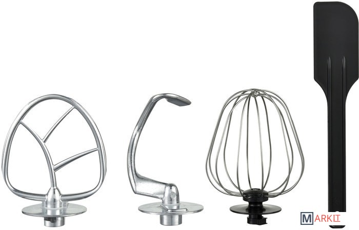 миксер, чаша из нержавеющей стали, крышка чаши, крючок для замеса теста, лопатка для перемешивания, венчик для взбивания, лопатка, гарантийный талон, инструкция |
