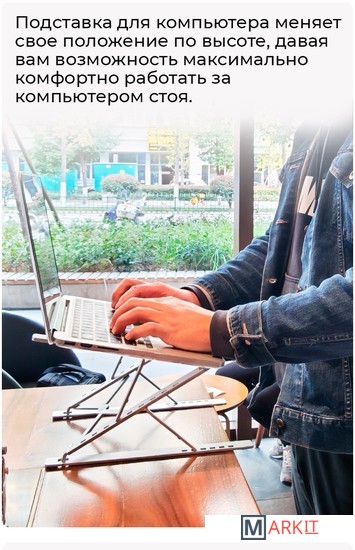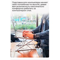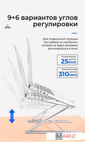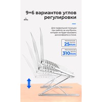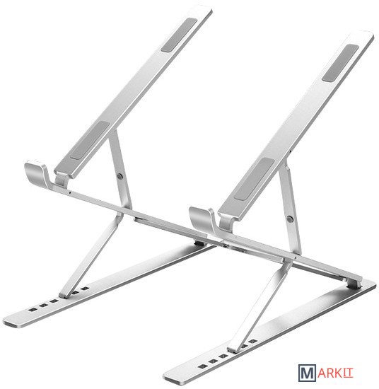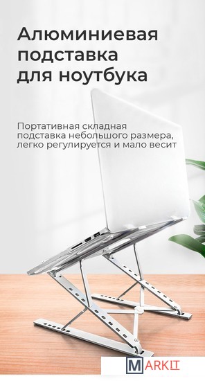 Алюминиевая подставка для ноутбука до 15.6''. Складная портативная конструкция, 9+6 вариантов углов регулировки, легкая и удобная транспортировка. Материал: алюминий + силиконовая резина.