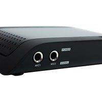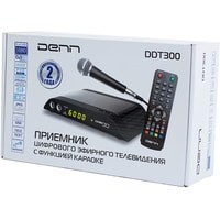Приставку Denn DDT300 можно использовать в качестве караоке. Она укомплектована двумя входами 6,3 мм для микрофонов, один из которых идет в комплекте.