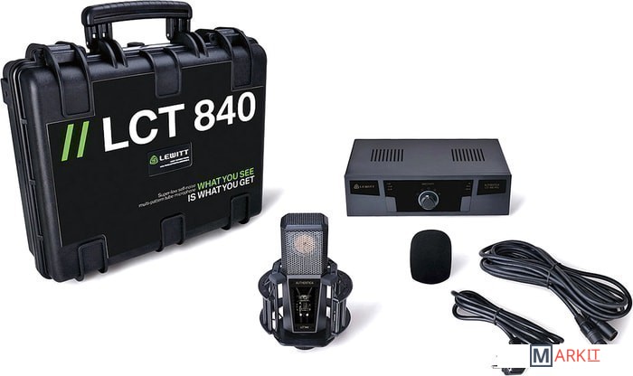 - съемная ветрозащита- аудиокабель (11-pin XLR)- антивибрационный держатель- устройстве подачи питания (LCT 840 PSU)- кейс- документация