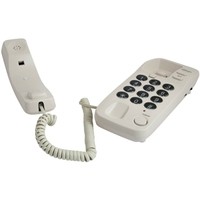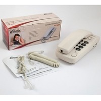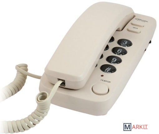 Узкий проводной телефон в настольно-настенном исполнении. Поддерживает как традиционный импульсный, так и современный тональный набор номера.