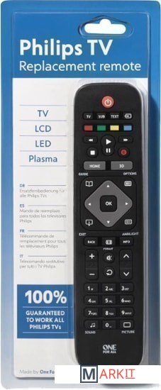 Пульт на замену для всех телевизоров PhilipsНастройка не требуется, просто вставьте батарейки. Поддерживает все распространенные функции Philips такие как Browse Menu, Home, Ambilight и Multi Menu Centre Island. Функция обучения позволяет настраивать пульт соответственно с вашими потребностями. Поддерживает все телевизоры Philips, включая плазменные, LCD и LED модели.