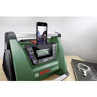 Портативный радиоприемник может использоваться как при проведении ремонтных работ, так и на досуге. Он может питаться от любой батареи Bosch, включая модели 10.8, 14.4 и 18 В, поддерживает проводное и беспроводное подключение к смартфонам и плеерам, имеет несколько ручек для удобной переноски и крепления.