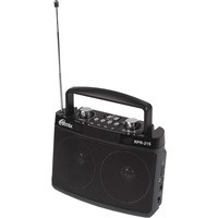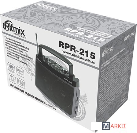 Ritmix RPR-215 – портативный трёхдиапазонный радиоприёмник, охватывающий в том числе и FM-диапазон. Дополнительная функция RPR-215 – воспроизведение mp3-файлов с карт памяти или USB-флэшки. Радиоприемник снабжен встроенной батареей.