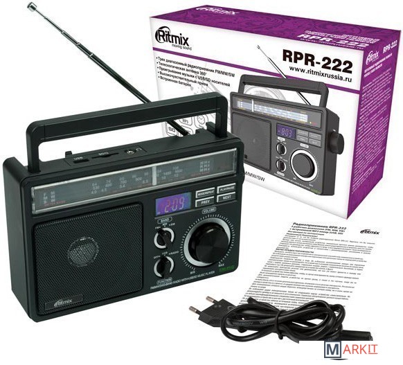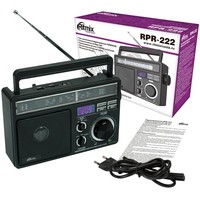 Ritmix RPR-222 — портативный радиоприёмник, работающий на трёх диапазонах, включая FM. Дополнительная функция — воспроизведение MP3-файлов с карт памяти SD или USB-флэшки.
