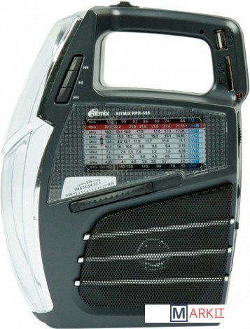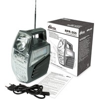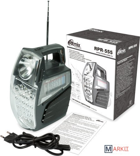 Ritmix RPR-555 — портативный радиоприёмник. Устройство работает на десяти диапазонах, включая FM. Дополнительная функция RPR-555 — воспроизведение MP3-файлов с карт памяти SD или USB-флэшки. Устройство оснащено двумя встроенными светодиодными фонарями.