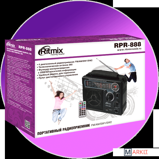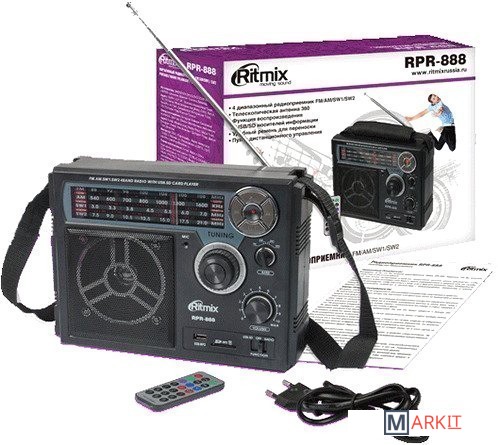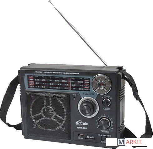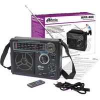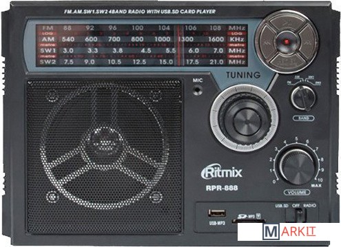 Ritmix RPR-888 – полноразмерный четырехдиапазонный радиоприёмник с функцией mp3-плеера и диктофона. Устройство может работать как от сети, так и автономно – от встроенного аккумулятора или батареек.