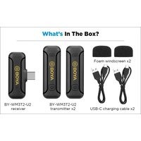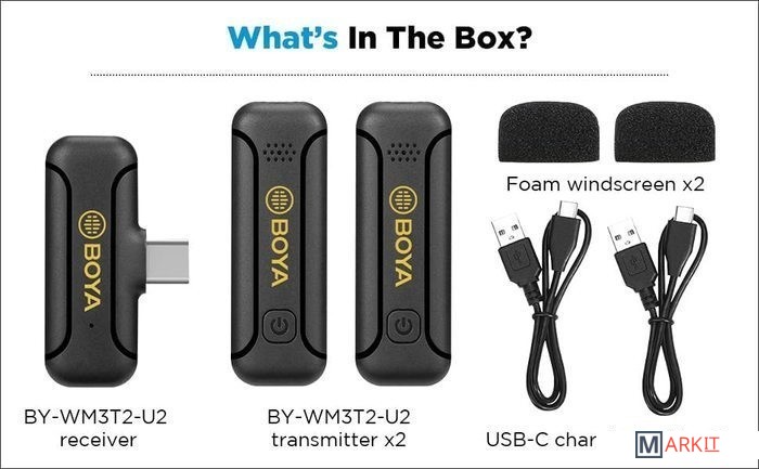 - портативный приемник- два портативных передатчика со встроенным микрофоном- комплект поролоновой ветрозащиты- два кабеля для зарядки- документация |
