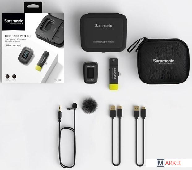 Saramonic Blink 500 Pro B3 - легкая и компактная беспроводная микрофонная система, состоящая из приемника, передатчика и петличного микрофона. Предназначена для записи звука при съемке зеркальными, беззеркальными фотоаппаратами, видеокамерами, а также с совместимыми мобильными устройствами - смартфонами и планшетами. В комплект радиосистемы входит профессиональная «петличка» Saramonic SR-M1, а передатчик оснащен также встроенным микрофоном. Контроль записи выполняется с помощью OLED дисплея. Аккумулятор передатчика может заряжаться через порт Micro USB DC 5V.