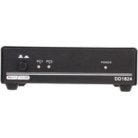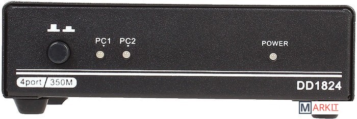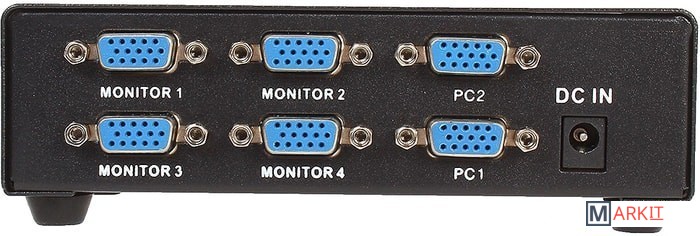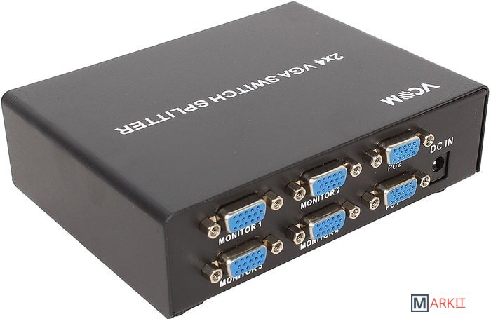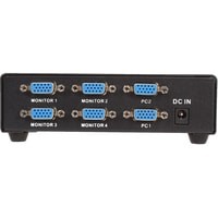 Данный сплиттер подключается к 2 источникам видеосигнала VGA и дублирует сигнал от выбираемого пользователем источника на 4 устройства отображения (мониторы, проекторы и т.п.).