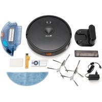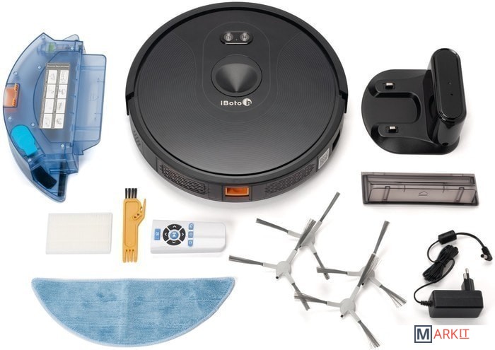 Робот-пылесос.Зарядная станция.Контейнер для влажной уборки.Контейнер для сухой уборки.Пульт ДУ.Сетевой адаптер.Запасные аксессуары: две боковая щетка, салфетка и фильтр.Инструкция по применению.Упаковка.