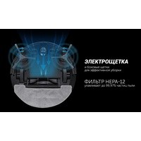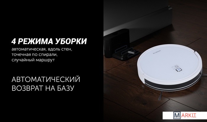 | Комплектация | 1. Робот-пылесос в сборе - 1шт.2. Пылесборник сухая и влажная уборка 2 в 1с фильтрами (установлены) и микрофиброй - 1шт.3. АКБ (аккумуляторная батарея - установлена) - 1шт.4. База для зарядки - 1шт.5. Зарядное устройство (адаптер) - 1 шт.6. Боковые щетки |